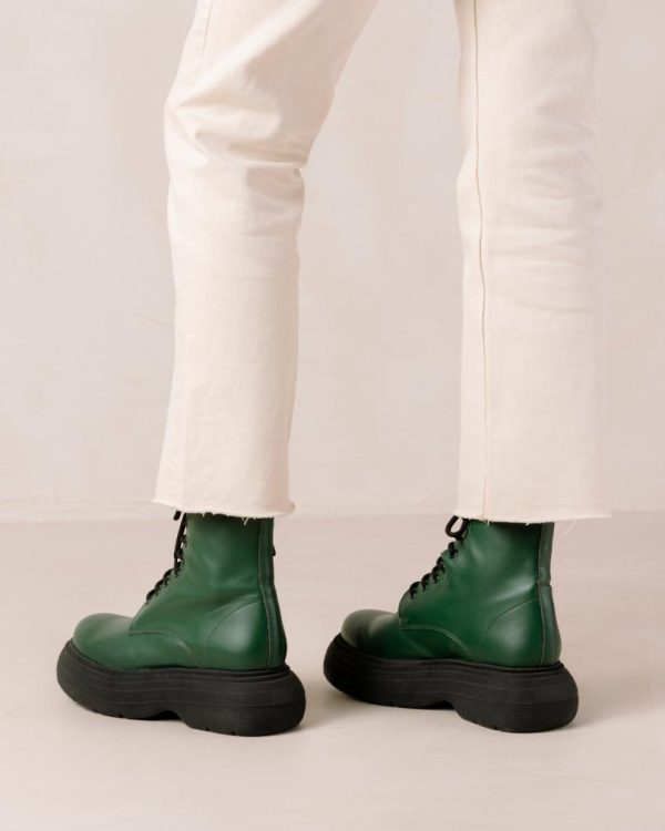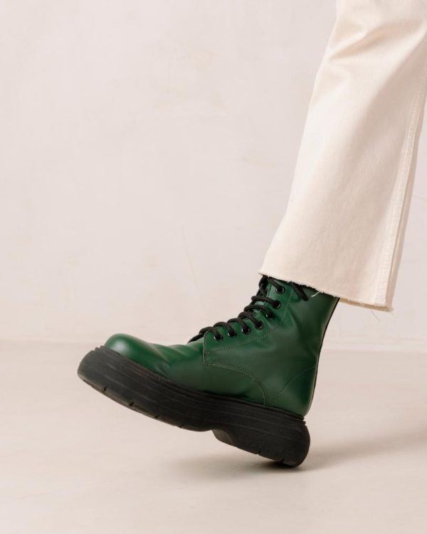 Modeled on traditional combat styles, these vegan boots are made from green faux leather and sit high on the ankle. They rest on softly rounded, oversized soles that promise a little lift. Opt for an unexpected fashion combo by pairing them with your flirty summer dresses and mini skirts. They are just the perfect way to transition between seasons.