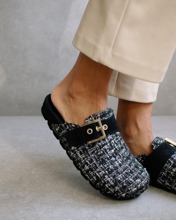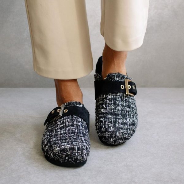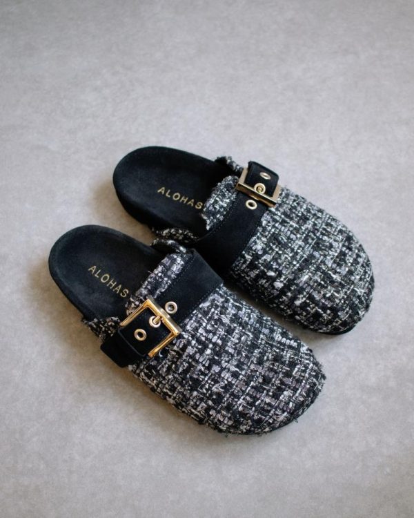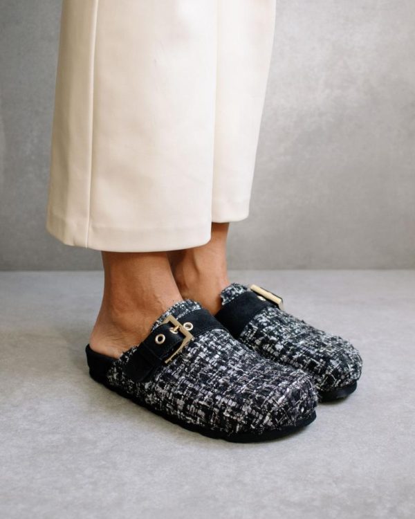 These cozy black tweed loafers are perfect for any casual occasion, featuring a comfortable sole and a classic look.