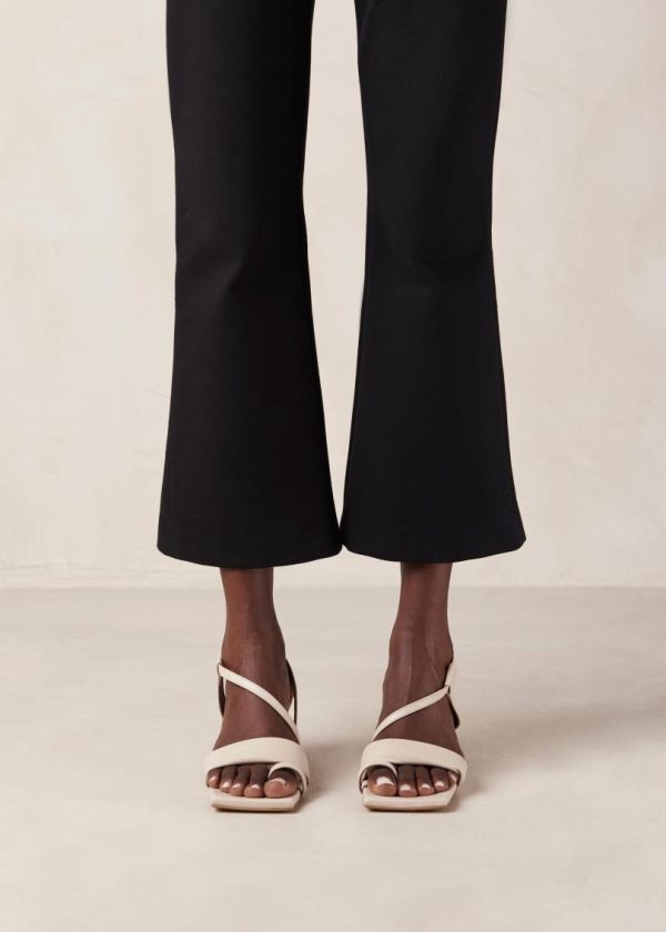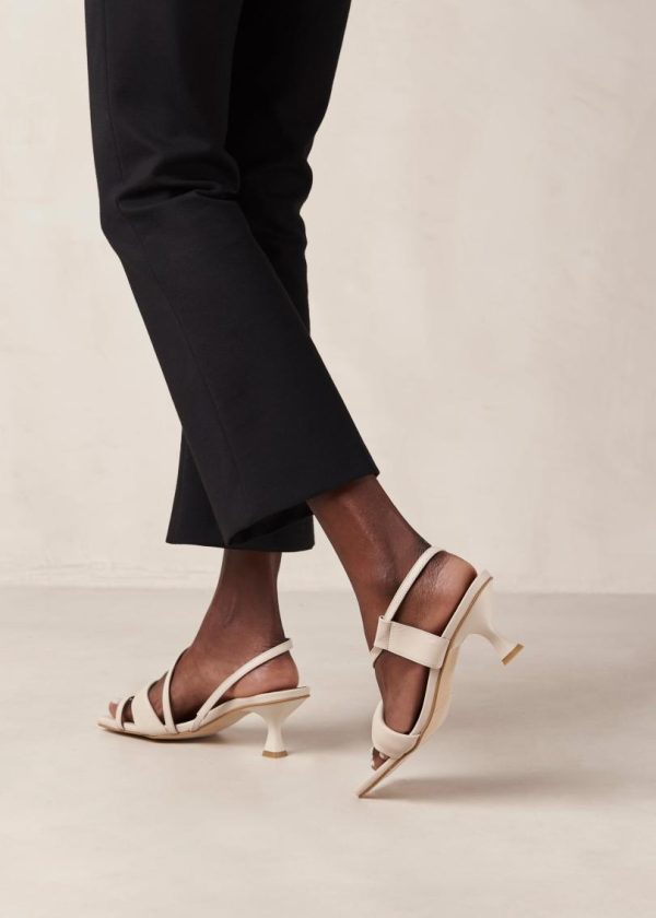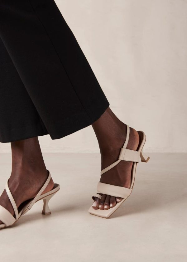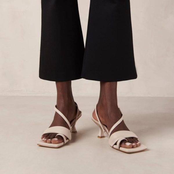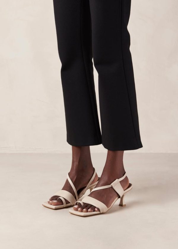Crafted from premium cream leather, this pair of asymmetric strappy sandals will look amazing with split-hem leggings and cropped jeans. The gorgeous squared toe enhances their modern, sculptural feel, while the cushioned front band and soft toe ring hug and support the feet. They are propped on 6.5cm kitten heels for comfort and elevation, all in one shoe.