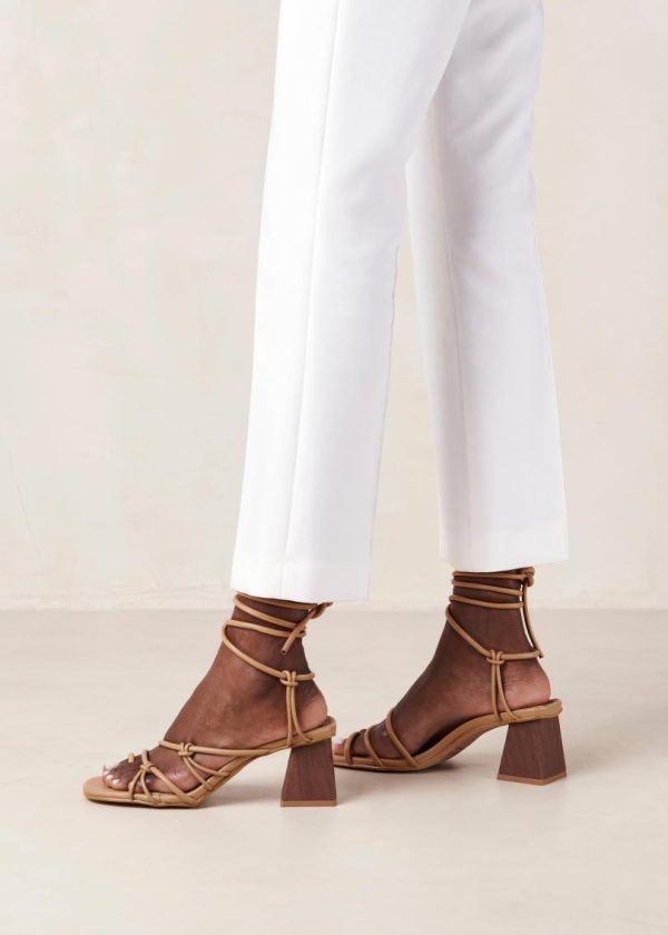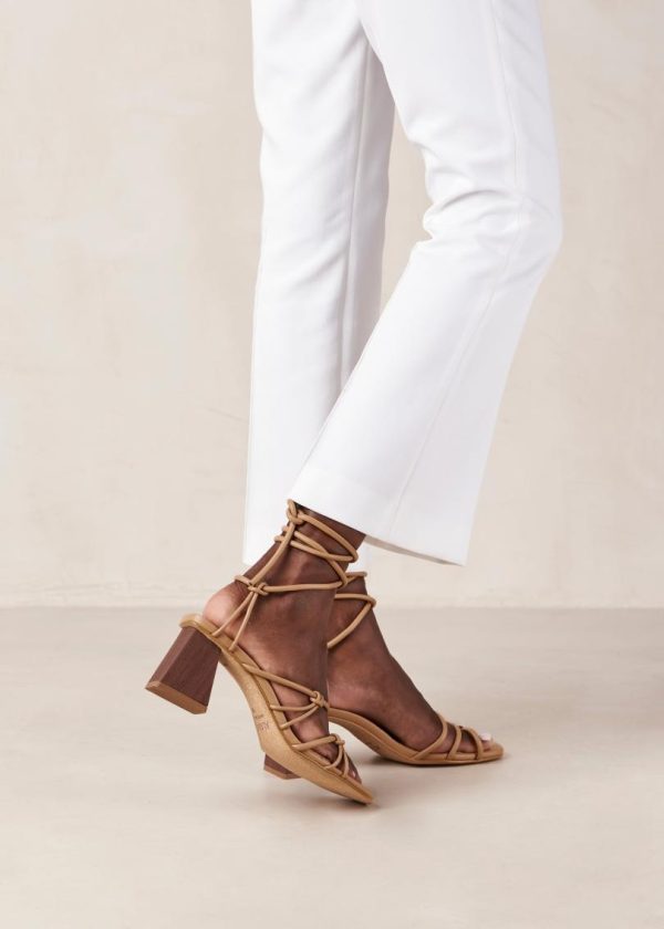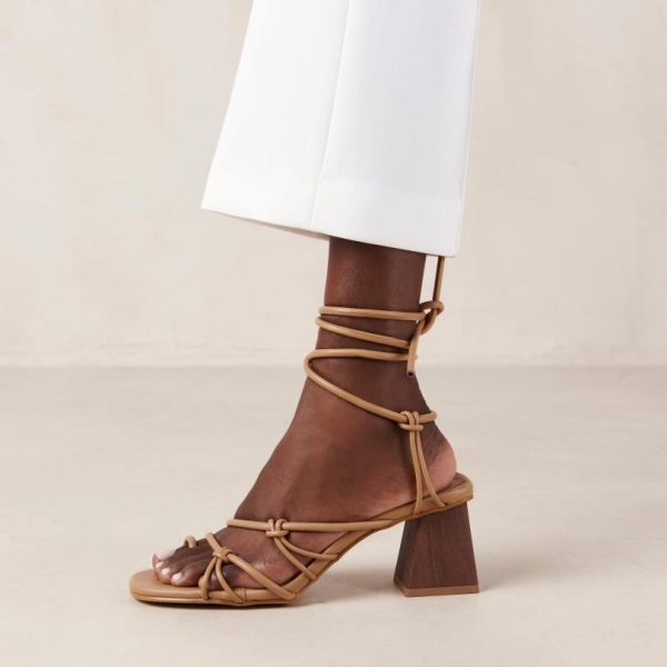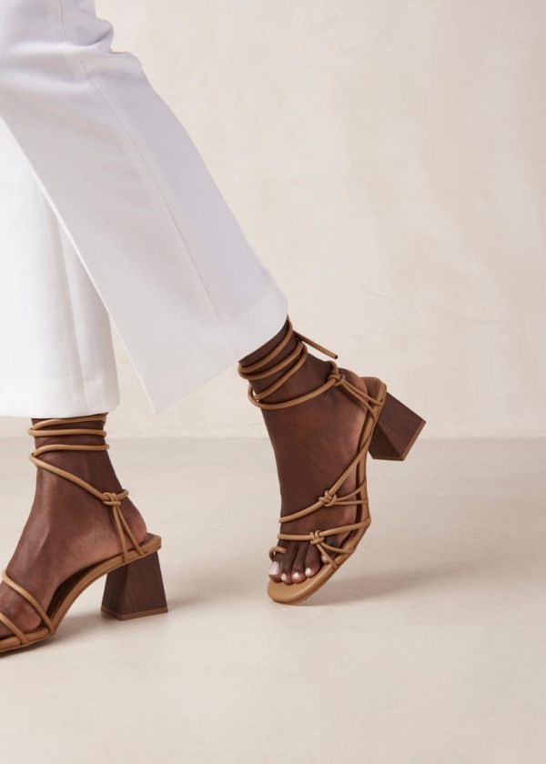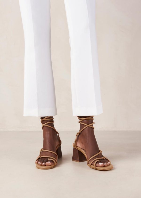 Strappy sandals are never an oldie but always a Goldie! Crafted from brown vegan leather to an intricately knotted, lace-up silhouette, these gracious summer shoes are set on flared block heels, ready to elevate any look of your choice. Play with the long ankle ties to create your personalized style and fit.