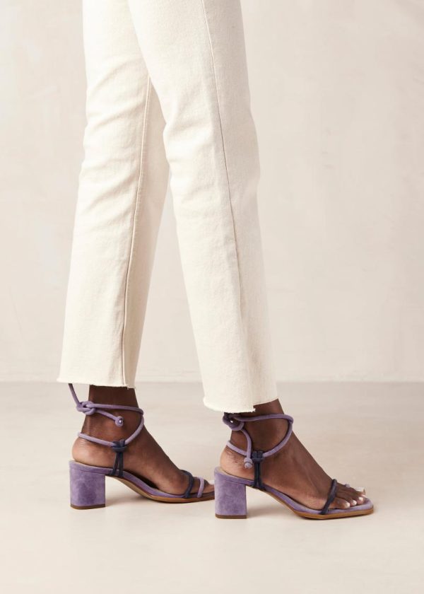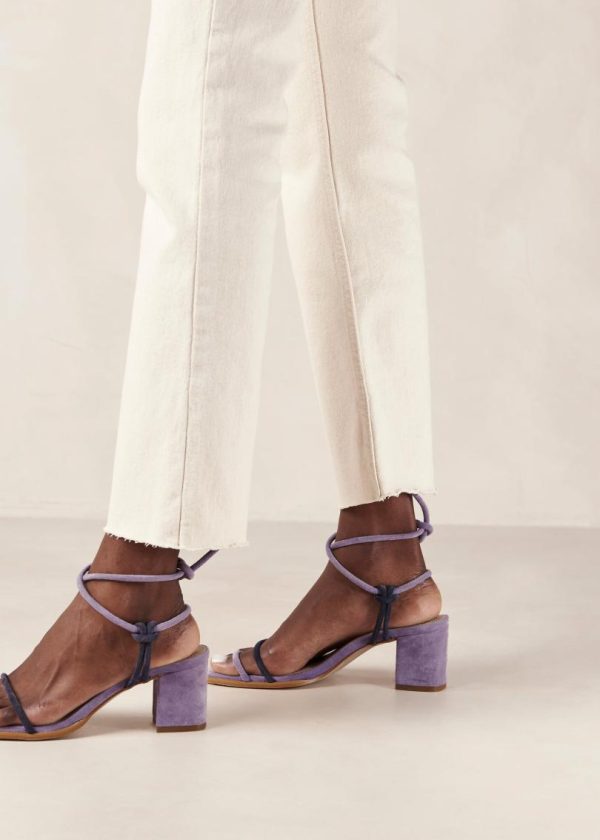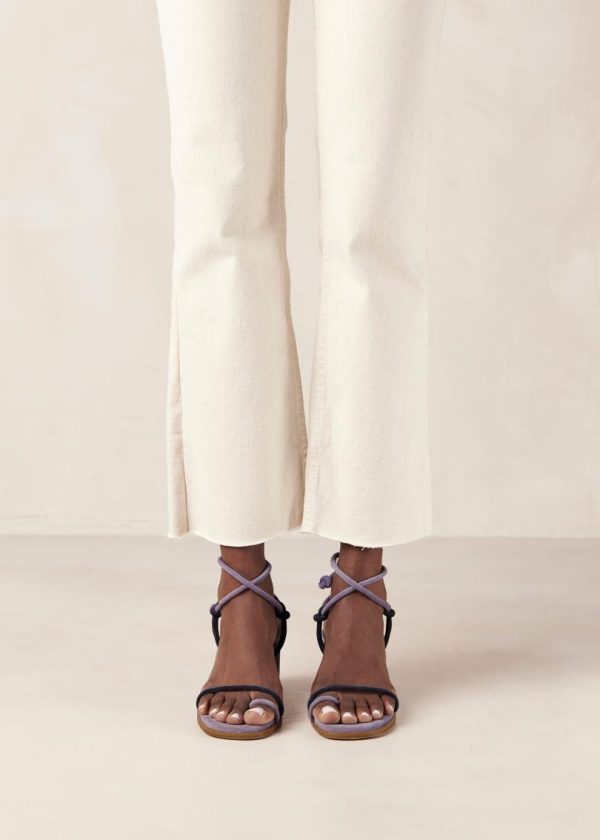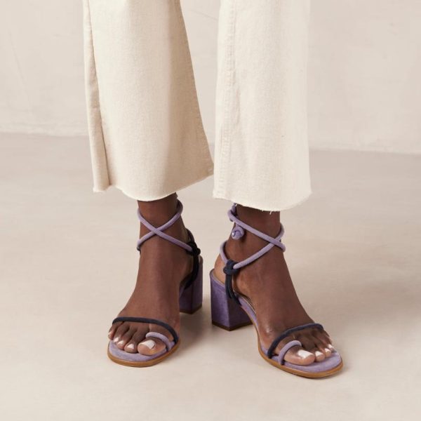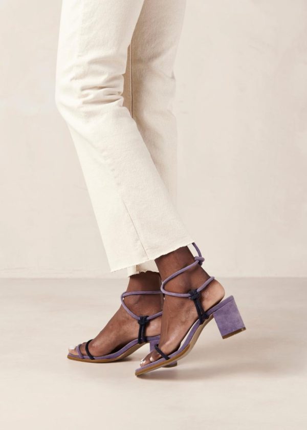 Let our all-time favorite strappy sandals *grace* your summer wardrobe. Featuring thin strings and crossover ankle ties, this pair is made in Spain from blue and purple suede leather. They sit on comfortable footbeds with block heels to lengthen the legs. Show them off with shorter hemlines and a bright pedi for an additional pop of color.