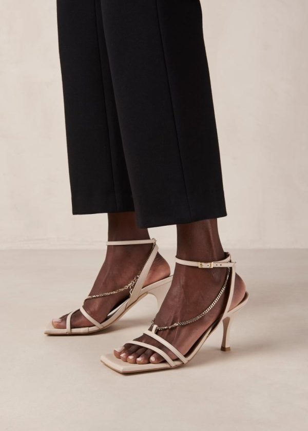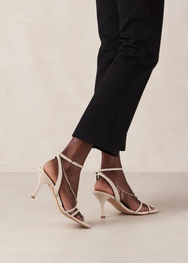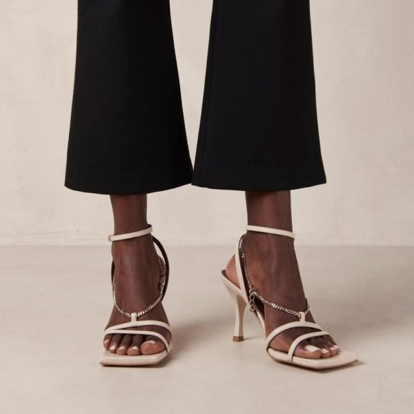 Footwear that feels like jewelry? Yes, please! Made from white leather strips threaded with a polished gold chain, these barely-there sandals will look sultry and glamorous on your feet. Secure them with the buckle on the slim ankle strap, then wow at how comfortable they are – they stand on slender stilettos with a slightly flared base, which makes them perfectly suited for a long night on the dance floor.