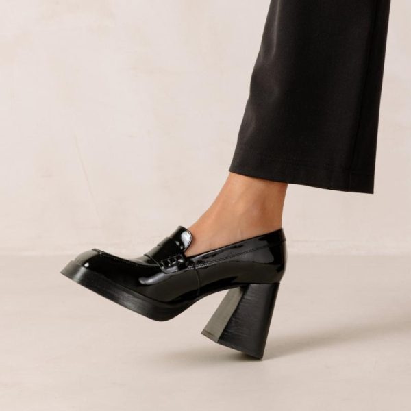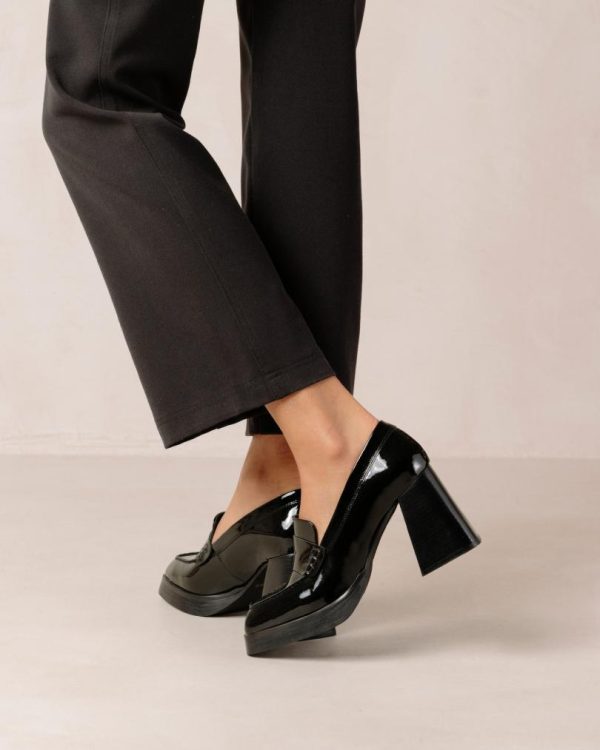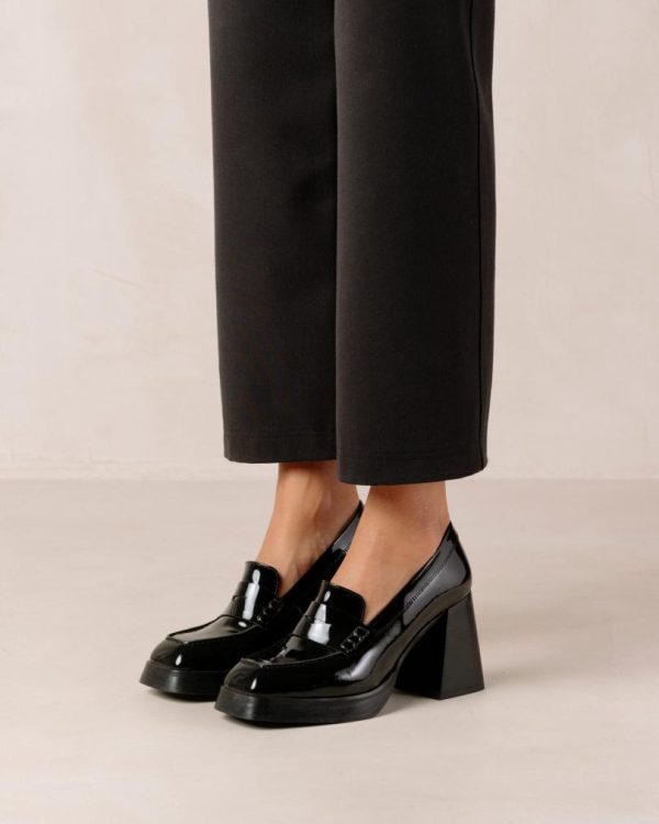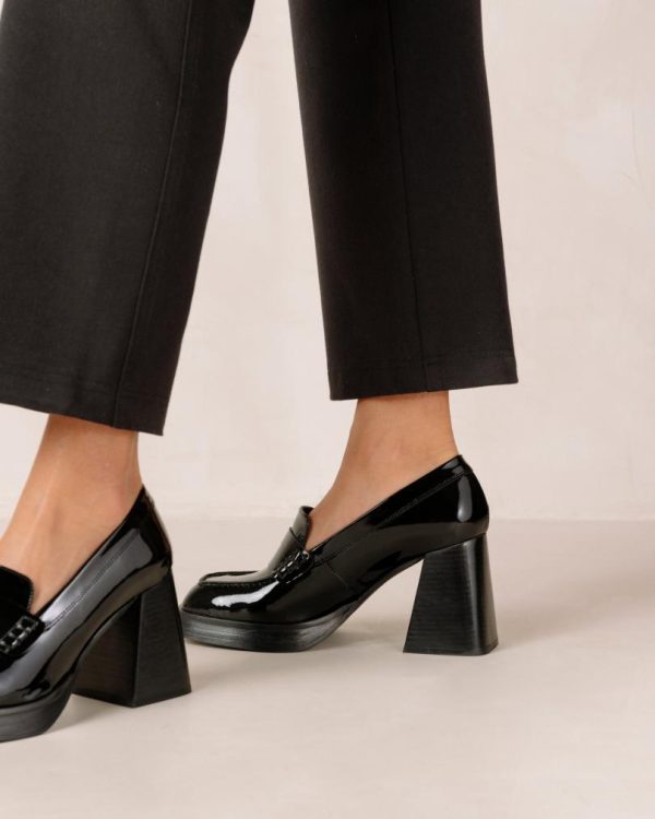 Hello, sexy shoes! Your classic penny loafer has gotten ten times hotter. Crafted from black patent leather, these flawless moccasin-style pumps are set atop a chunky flared heel for a solid sculptural feel. We recommend wearing them with exposed withe crew socks and cropped flares for a full-on retro look.