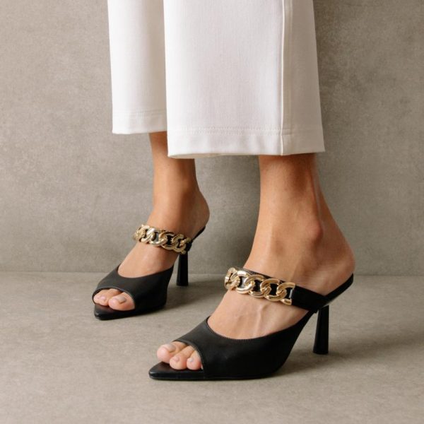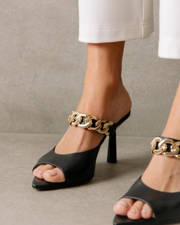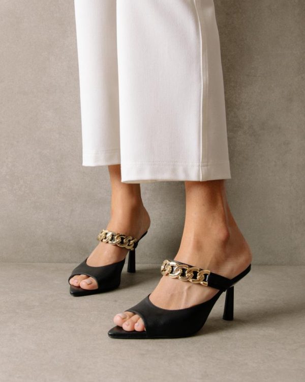 Slender stilettos, pointy toes and shiny hardware? The Daisy mules have sass written all over them. Crafted from black leather, they feature curved open-toe vamps and arch straps molding to the instep. The lightly flared heel provides a generous yet manageable 8.5cm lift, which is kind to your feet. Wear yours with confidence and plenty of attitude.