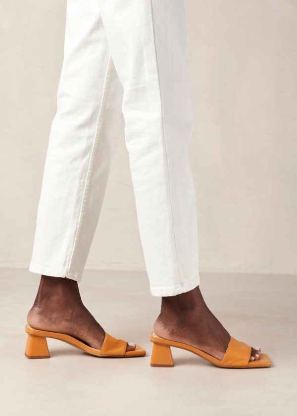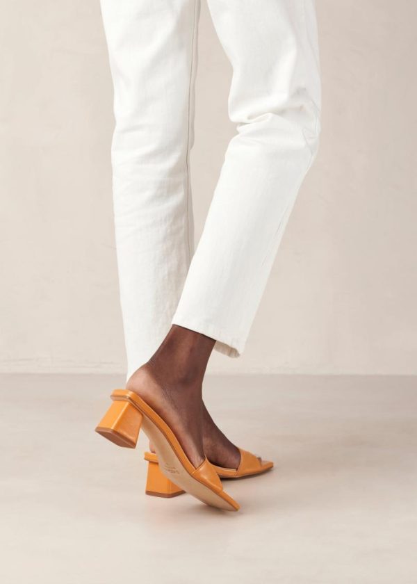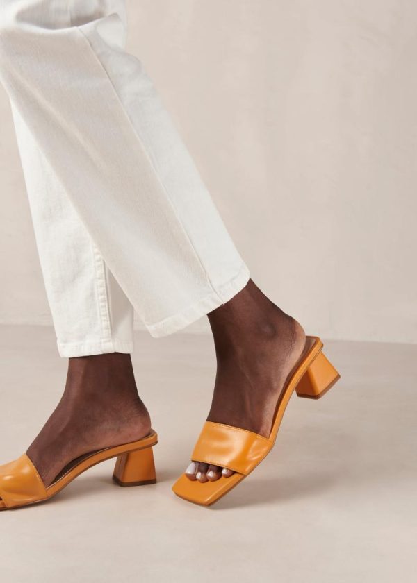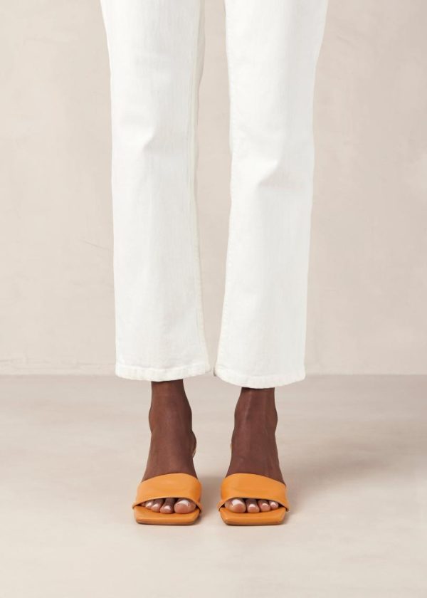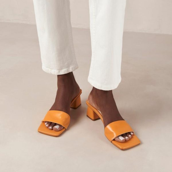 Set atop a low block heel for comfortable elevation, these slip-on-and-go, vegan leather mules have been named after their contemporary squared open-toe. They are crafted from orange faux leather and feature a wide upper strap that promises style and support when hitting the streets. Add them to your footwear rotation asap.