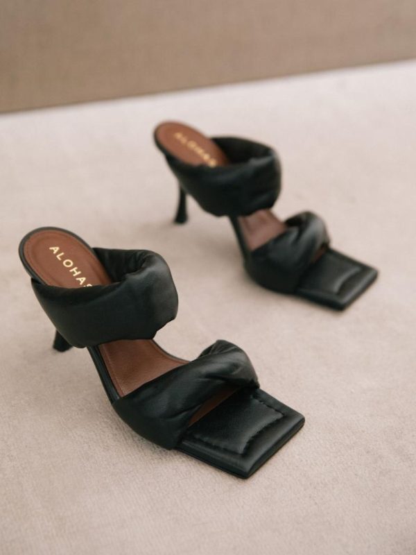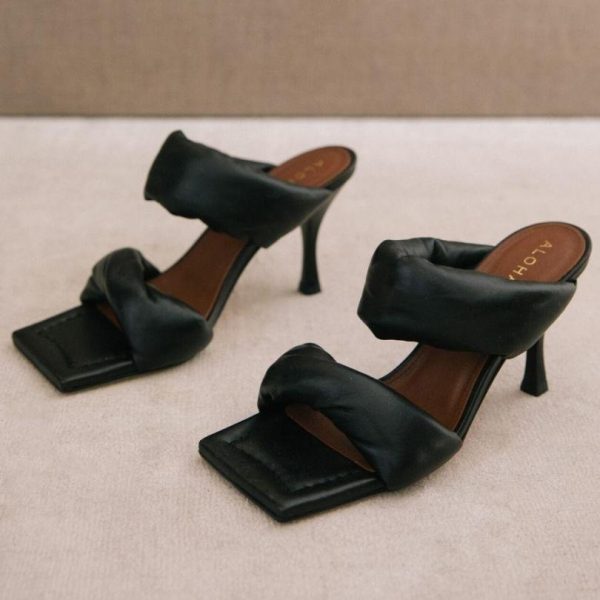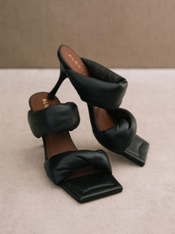 Who said sandals were summer only? Twist knows no season. These black double strap heels feature a square toe, a pointed heel, and two very chunky padded straps: one behind the toes for maximum grip and comfort, and one between the instep and ankle area. These sustainable sandals offer a shiny leather finish.